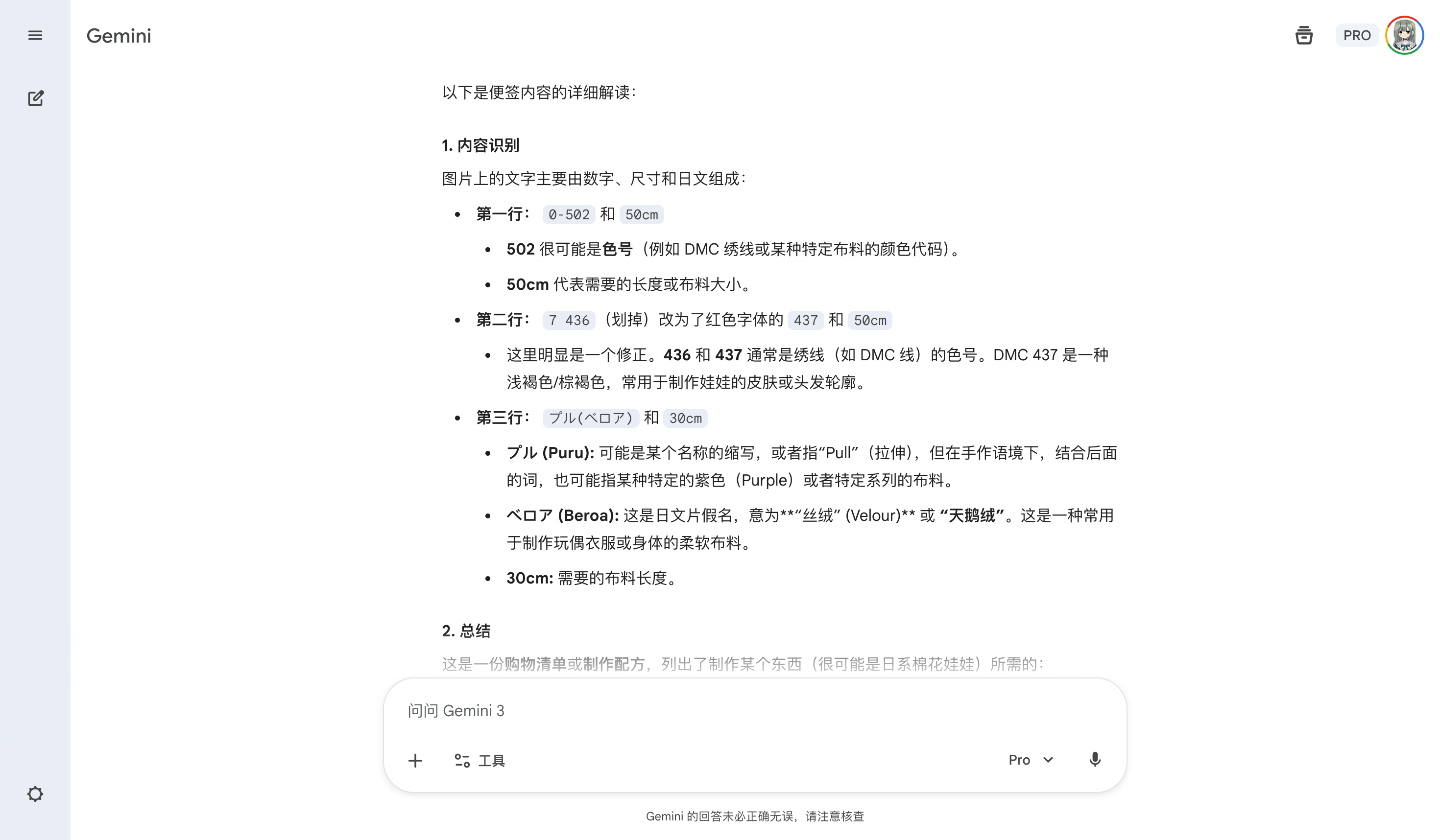 在移动端我的主力聊天机器人 APP 也是 Gemini,得益于 Gemini 3 Pro 强到离谱的图像性能和知识面,我可以直接截图、分享图片给 Gemini 加上简单的问题就可以获得准确的答案。例如在下面这个用例里 Gemini 凭借这么一点图片信息就能得出便签上的信息是布料清单的结论。